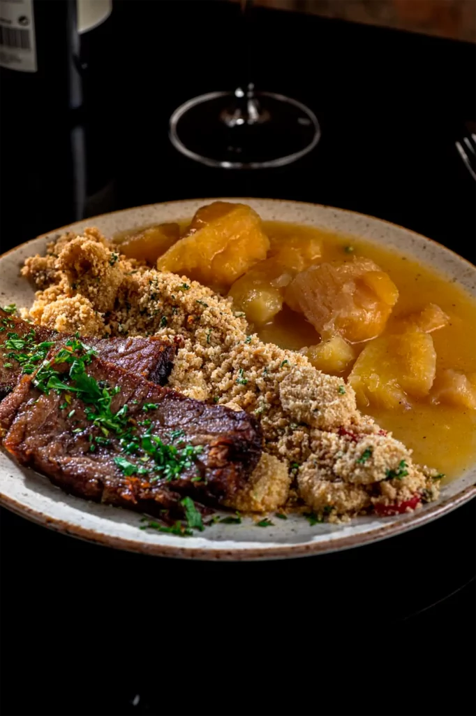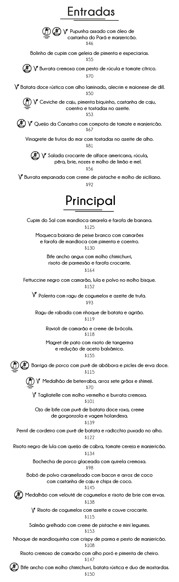 A cozinha é comandada pelo Chef Henrique Fogaça e traz surpresas que fazem do lugar um dos hits da gastronomia paulistana. Entre os destaques estão o Cupim do Sal com Mandioca Amarela e Farofa de Banana, referência ao prato restaurante Sal, de Fogaça; o Ragu de Rabada com Nhoque de Batata e Agrião, o Fettucine Negro com Camarão, Lula e Polvo no Molho Bisque e o famoso Brigadeiro de whisky, sorvete de baunilha, calda de chocolate e crocante de castanha de caju.